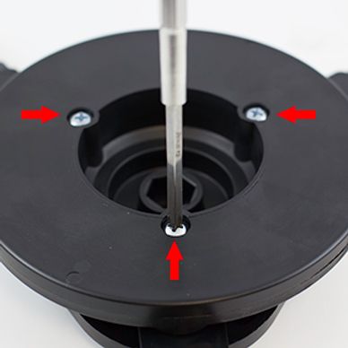 With the GrassGator head off your trimmer, undo the 3 safety screws. You can now pull the top and bottom halves of the GrassGator apart to expose the pins.